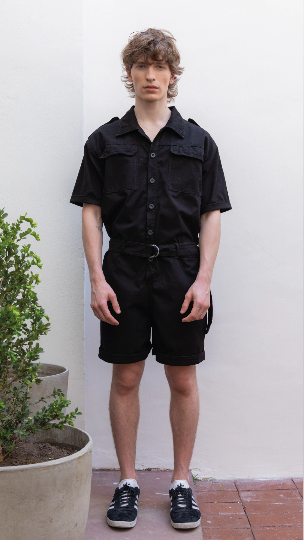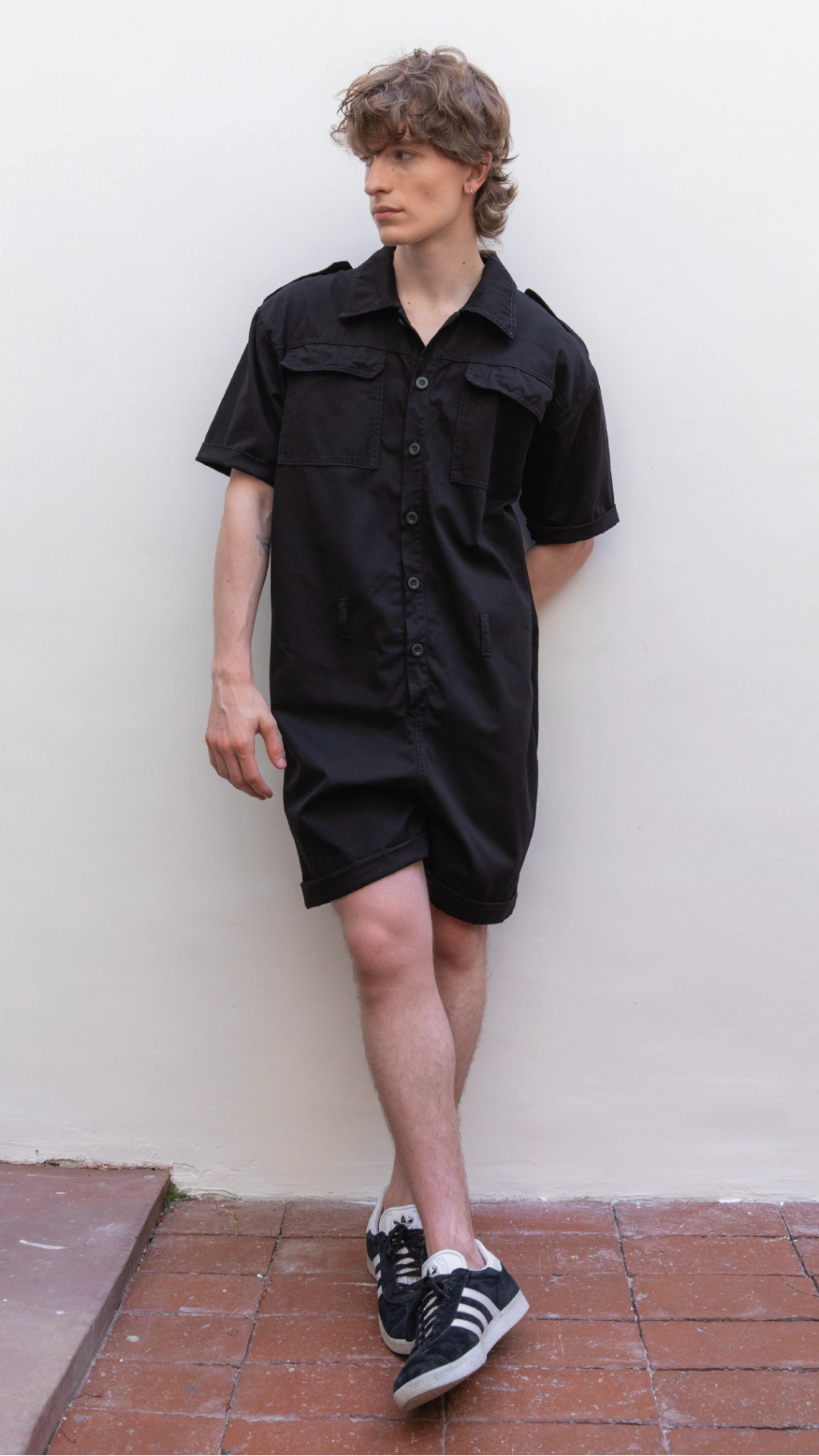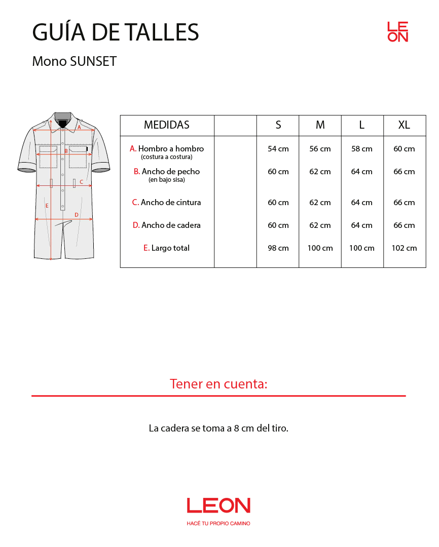 SUNSET es un una monoprenda, de corte recto, pensado para el verano de piernas y mangas cortas. Regulable por medio de un cinto de ajuste con hebillas de zamak.
