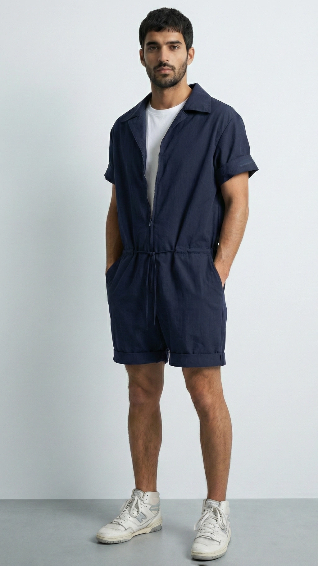 SALTY es un un overol de corte recto, de piernas y mangas cortas, pensado para usar arremangado.